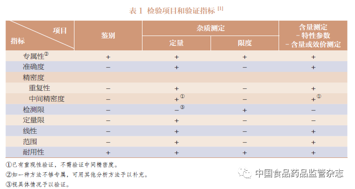 分析方法驗(yàn)證的目的是證明建立的方法適合于相應(yīng)檢測(cè)要求。在藥品質(zhì)量標(biāo)準(zhǔn)建立和修訂時(shí),需對(duì)分析方法進(jìn)行驗(yàn)證?!吨袊?guó)藥典》自2000 年版開始收載分析方法驗(yàn)證指導(dǎo)原則,為藥品分析方法建立提供指導(dǎo)?!吨袊?guó)藥典》2020 年版四部9101 分析方法驗(yàn)證指導(dǎo)原則中規(guī)定的驗(yàn)證指標(biāo)有:專屬性、準(zhǔn)確度、精密度(包括重復(fù)性、中間精密度和重現(xiàn)性)、檢測(cè)限、定量限、線性、范圍和耐用性等,不同的分析項(xiàng)目相應(yīng)的驗(yàn)證指標(biāo)見表1[1,5]