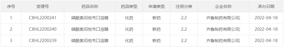 4 月 18 日,根據(jù) CDE 官網(wǎng)信息,齊魯制藥 2.2 類改良型新藥 磷酸奧司他韋口溶膜 臨床申請獲受理。這是國內(nèi)首家開發(fā)奧司他韋口溶膜的企業(yè)。