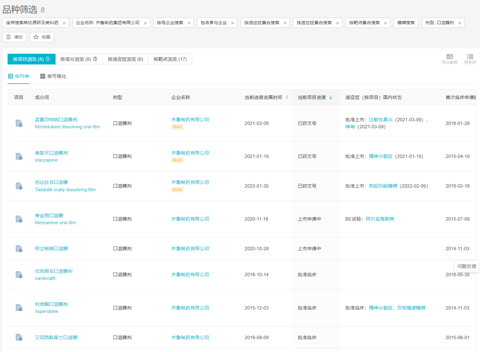 在國內(nèi)仿制藥競爭激烈疊加集采的情況下,探索更適合患者的改良型新藥或許是個不錯的選擇。據(jù) Insight 數(shù)據(jù)庫,齊魯制藥的化藥改良型新藥聚焦于口溶膜領(lǐng)域,此前已有 8 個口溶膜項目開發(fā),其中 3 款已經(jīng)獲批上市,2 款已經(jīng)申報上市,詳見下圖: